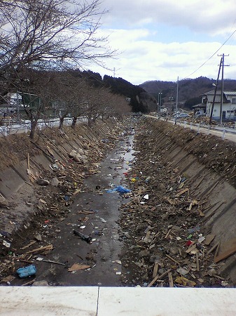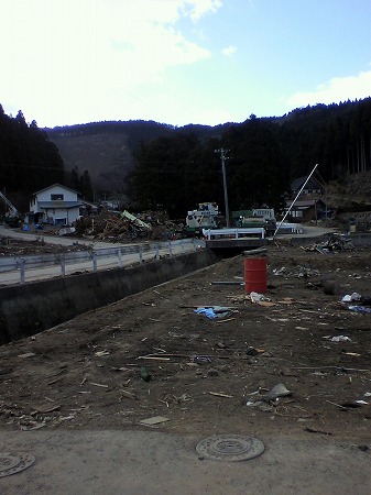 | 綾里中から。綾里小の新学期はとりあえず中学校体育館でスタート予定 | 道路は以前より広がっています。あらたにガレキ処理の問題が発生しています。 県や国の早期処理が望まれます。 |